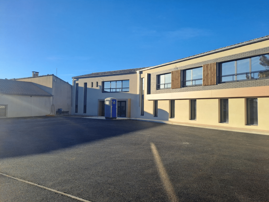 🔹 Phase 3 – extension sur 2 niveaux (RE2020) : démolition du bâtiment existant et désamiantage, puis réalisation d’un bâtiment en maçonnerie traditionnelle, charpente bois, cloisons placo
